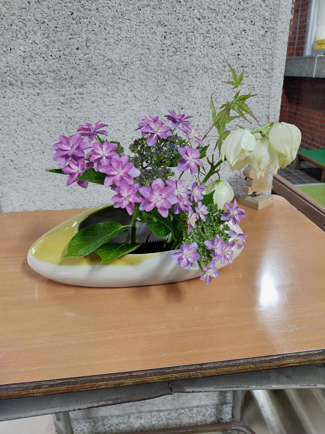 今月の活動では校内に咲いている葉や花を切って各々生けました。