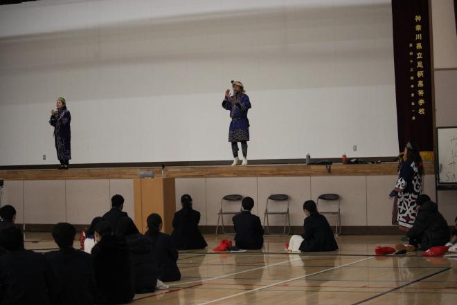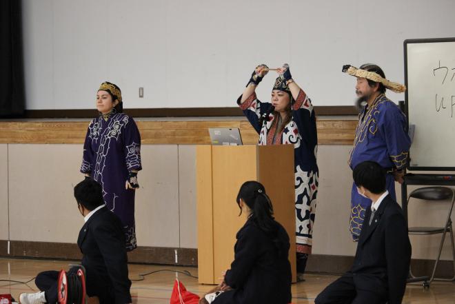 講話ではクイズを織り交ぜながらアイヌの歴史や文化の概要について貴重なお話をしていただき、体験活動ではアイヌに伝わる伝統的な歌を一緒に歌わせてもらったり、実際に舞踊を踊ったりしました。