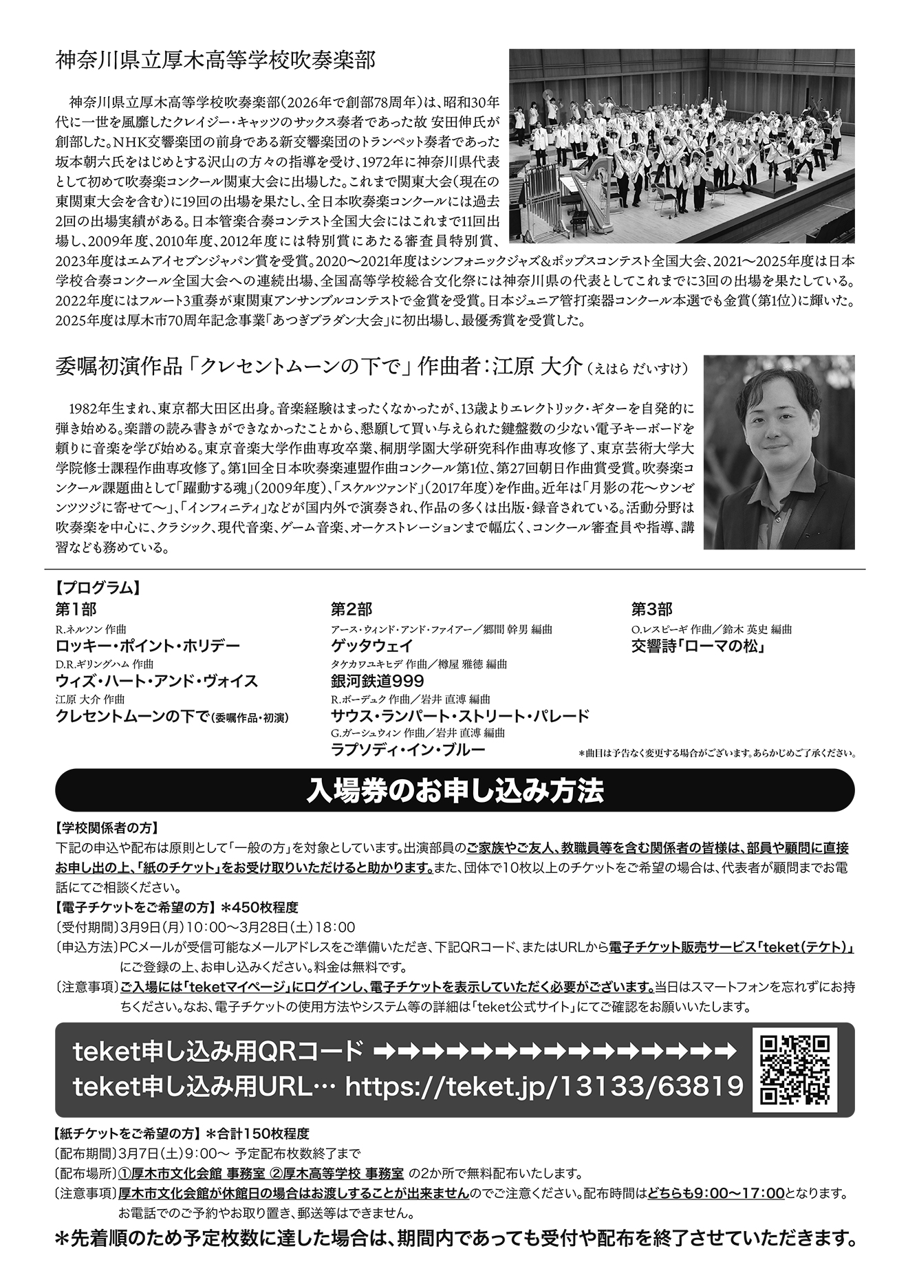 吹奏楽部の第33回定期演奏会を、2026年3月28日(土)に厚木市文化会館にて開催いたします。入場無料ですが、事前申込制となっております。電子チケットをご希望の方は、3月9日の10:00~、以下のURLまたはQRコードからteketのサイトにアクセスしていただき、お手続きをお願いします。紙チケットは3/7より配布を開始いたします。詳細についてはチラシの内容をご確認ください。皆様のご来場を心よりお待ち申し上げております。