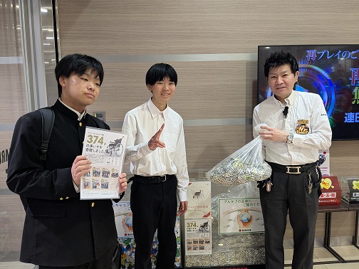令和7年3月27日にボランティア同好会2名は、校内で回収してきたプルタブを株式会社マルハン茅ヶ崎店に届けました。2年生の冨樫さんは「このプルタブが車椅子と交換され、福祉施設等に寄贈されると聞いてうれしく思った」と感想を話してくれました。