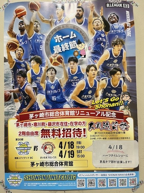 令和7年4月18日(金曜日)に茅ヶ崎市総合体育館で行われるバスケットボールの試合ハーフタイムショーにチアリーディング部が出演します。
