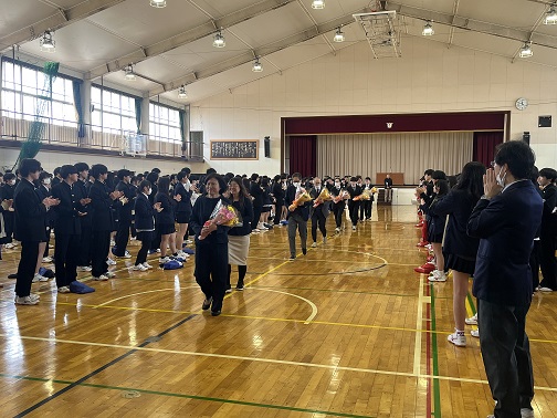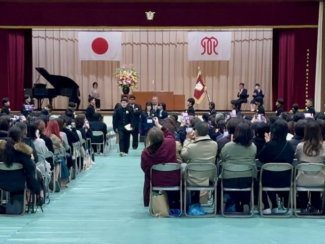 体育館で行われた卒業式では、担任から1名ずつ名前が読み上げられ、クラス代表の生徒が壇上で卒業証書を受け取りました。