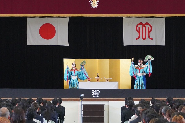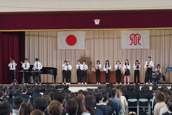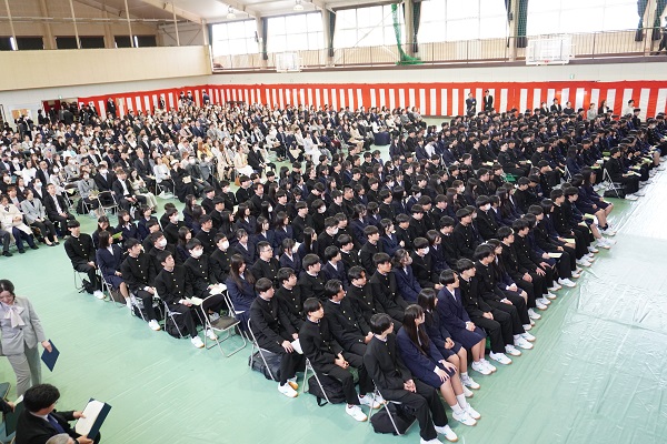 体育館で行われた第77回入学式では、新入生288名が1年生担任から1名ずつ呼名を受け、茅ケ崎高校に入学しました。入学式の前には文楽部による三番叟、式後には吹奏楽部による歓迎の演奏、合唱部による校歌紹介がありました。校門前にはPTA環境委員会が準備した写真スポットで多くの家族が記念の写真撮影をしていました。