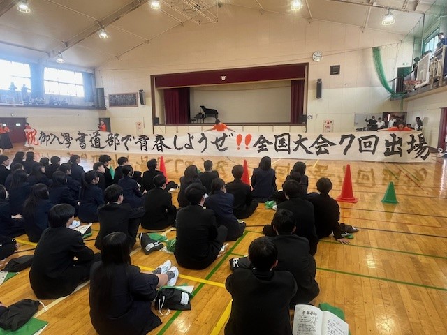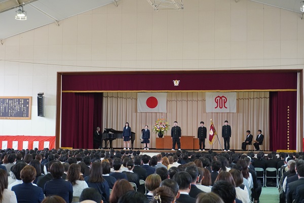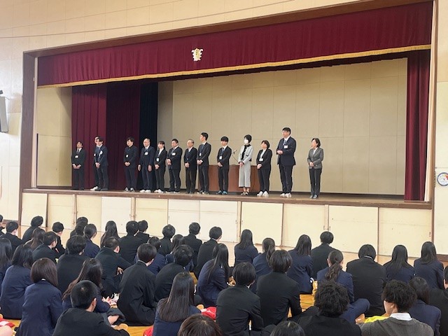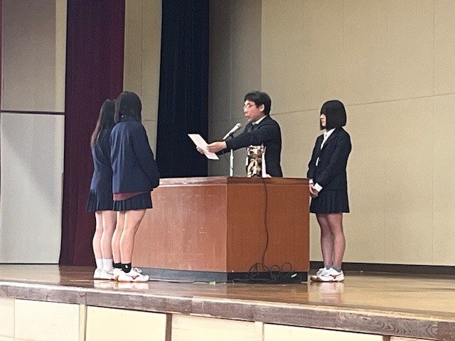 体育館で令和7年度の始業式が行われ、式後にはバドミントン部と女子バレーボール部が壇上で表彰を受けました。また、着任式では、新しく赴任した15名の先生が紹介されました。その後、各教室で新年度初めてのホームルームが行われました。