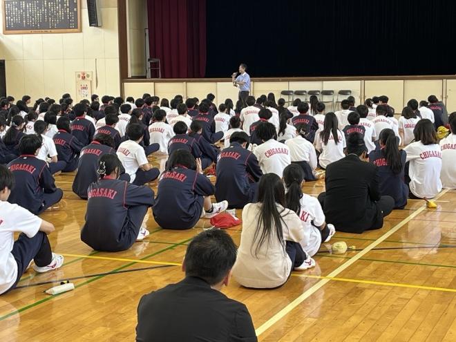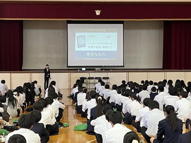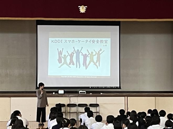 1年生を対象に携帯電話教室を行いました。インターネットへの投稿をきっかけとしたトラブル、スマホ(動画サイト、SNSなど)への依存、高額収入を得られるアルバイト(闇バイト)の危険性などについて学習しました。
