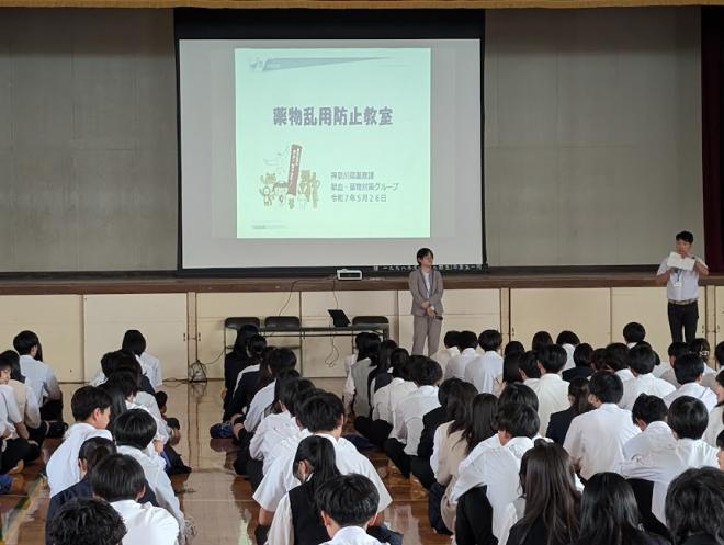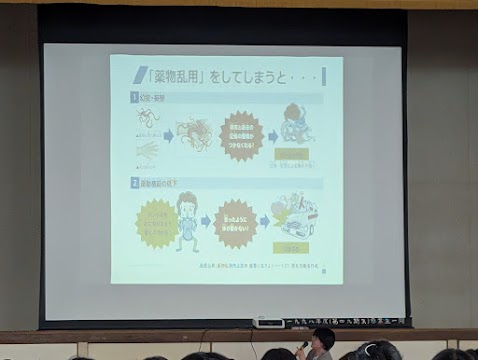 神奈川県健康医療局生活衛生部薬務課の方に来ていただき、薬物乱用防止について講演をしていただきました。生徒は薬物が体に及ぼす害などを具体的に聞いて、薬物の怖さを学びました。