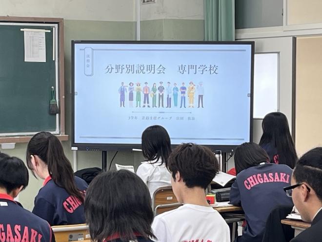 進路決定に向けて、3年生を対象に分野別進路説明会を行いました。前半は体育館で3年生全員に今後の日程と心構え、約束事について確認し、後半は大学短大、専門学校、家政系、看護医療系、体育系、就職公務員の6分野に分かれて書類の準備や書き方、注意点について確認しました。