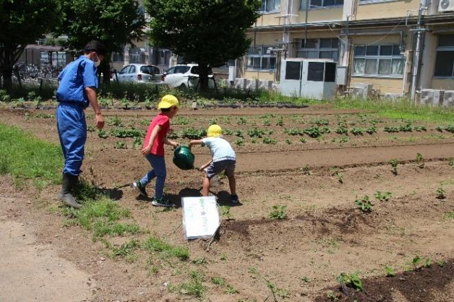 メリーポピンズ海老名ルーム保育園の園児がサツマイモの水やりや雑草を抜きに訪れました。植え付けたサツマイモが元気よく育っている姿を見て、楽しそうにお世話をしていました。