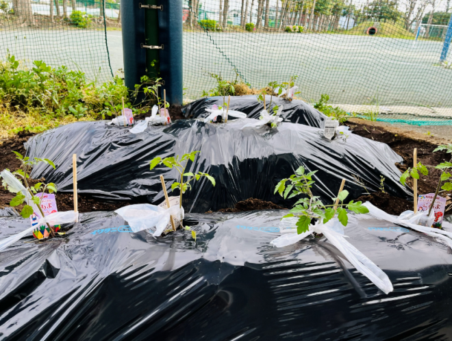 みんなで力を合わせて雑草抜きをした畑に、トマトの苗を植えました。