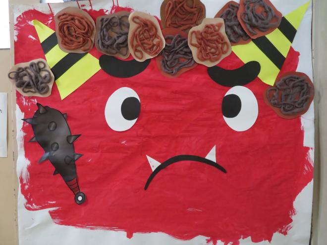 節分に合わせて1年生では各クラスで鬼の顔を作りました。赤鬼・青鬼をそれぞれ作り、豆の代わりにビニールの中にお花紙を詰めたボールで豆まきにちなんで、的あてをしました。「鬼は外!福は内!」福がたくさん訪れますように!コロナに負けずに元気に過ごしましょう!