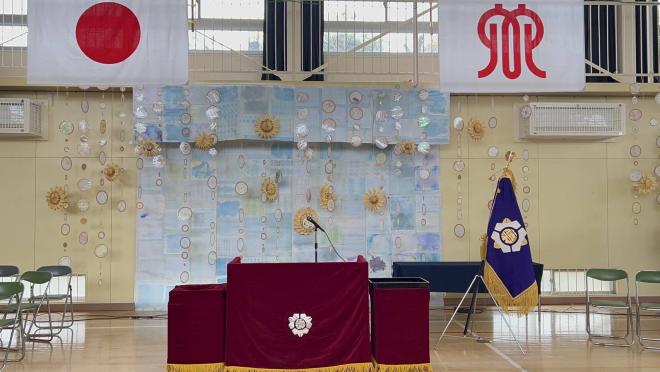 会場には、本校と分教室の生徒が力を合わせて作った地球の模型や、モザイクアート、陶芸作品等の卒業制作が展示され、式典の場を華やかに彩りました。