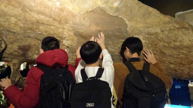 レクチャー後は、館内見学です。実物の板根を触って確認しました。