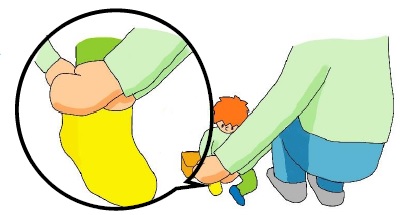 見えにくさのある子どもの場合、足が靴にどのように入っていくかを目で確認することに困難さがあります。手を添えて「お手てで、お靴持って、せーのでポン。」などと履く動作を口に出しながら、一緒にやってあげてください。また、靴の脱ぎ履きがしやすい工夫として、子どもが座って靴まで手が届きやすい高さの台に座ったり、大きめの長靴などを使ったりするとよいですね。