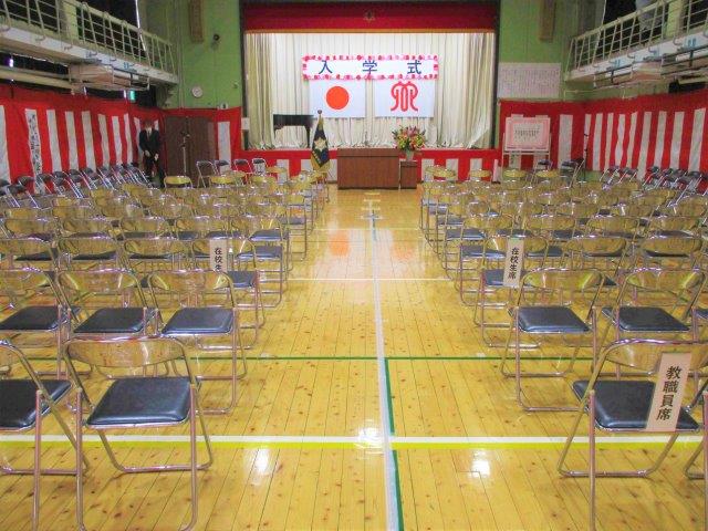 写真の2枚目は、開会式前の会場(体育館)の様子です。式中は緊張とこれから始まる学校生活に期待する様子が覗えました。