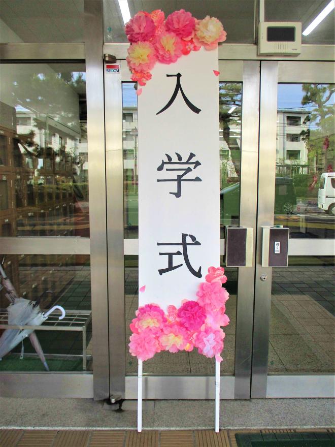 写真の1枚目は、正面玄関に立てかけた「入学式」の看板です。新入生がこちらで写真を撮影する姿が見られました。