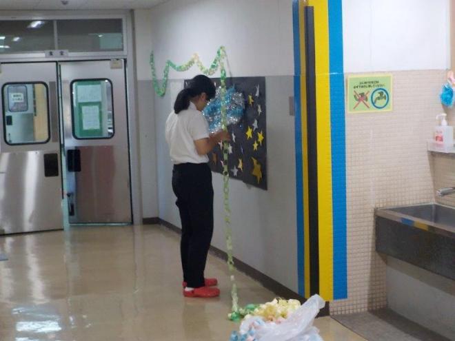 写真は、天の川を輪飾りで囲っている様子です。事前に作った輪飾りで、夕食会、レクリエーション会場となる食堂までを綺麗に飾ってくれました。