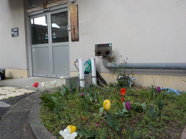 (寄宿舎玄関。卒業舎生が植えてくれたチューリップの写真)