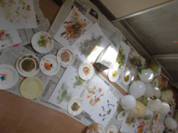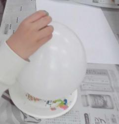 風船を使ったスタンプで制作を行いました。風船が割れないようにそっと絵の具をつけて画用紙にペタペタ…。絵の具が混ざりながら画用紙や模造紙に色がついていく様子を、興味深そうに見ながら楽しむことができました!