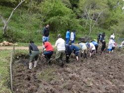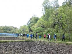 新年度に入り、舞岡分教室では新入生とともに新しく田んぼの作業を始めました。今回の作業は「田おこし」です。3月に行った荒おこしで柔らかくなった田んぼの土を、鍬でさらに掘りました。はじめて田んぼに入る新入生は、柔らかくなった土に思いのほか足が取られ驚いていましたが、泥だらけになって田おこしをすることができました。
