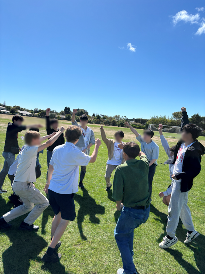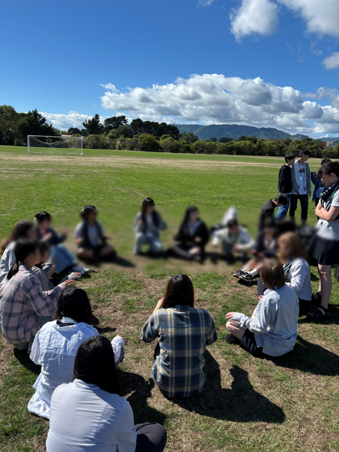 今回の主な訪問先であるパラパラウムカレッジでは、マオリ伝統の歓迎の儀式を開いていただきました。パラパラウムの生徒たちによるマオリの歌やハカの披露があり、それらの迫力に圧倒されました。鎌倉高校の生徒たちは、お礼として校歌を歌い、鎌倉彫のお盆を贈った後、軽食をいただきながら、マオリのゲームで交流のときを過ごしました。