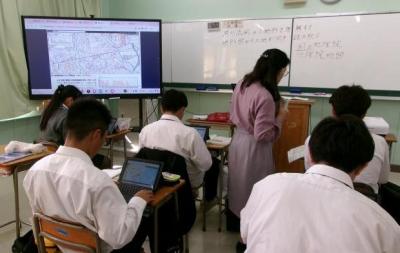 ↑タブレットで地理院地図を開き、地形の特徴を調べる活動