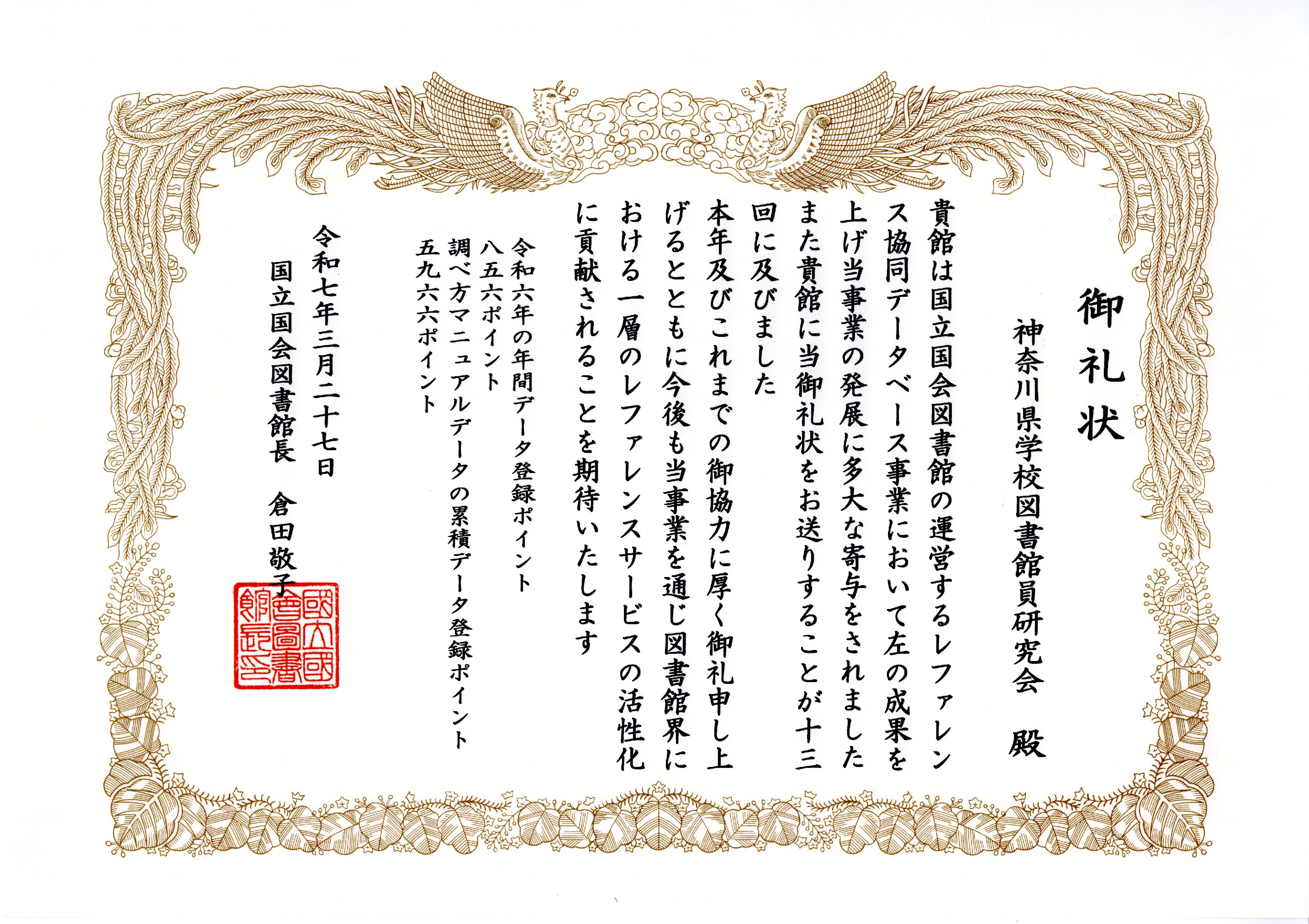 今年度の年間データ登録ポイントと、調べ方マニュアルデータの累積データ登録ポイントが規定に達したことにより、国立国会図書館からお礼状をいただきました。