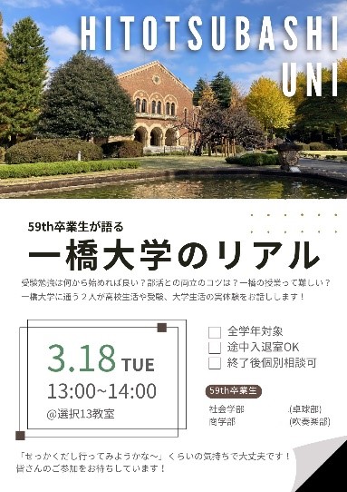 本校の卒業生が大学に進学して実際に感じていること、後輩へ向けたアドバイスなどを聞く機会です。