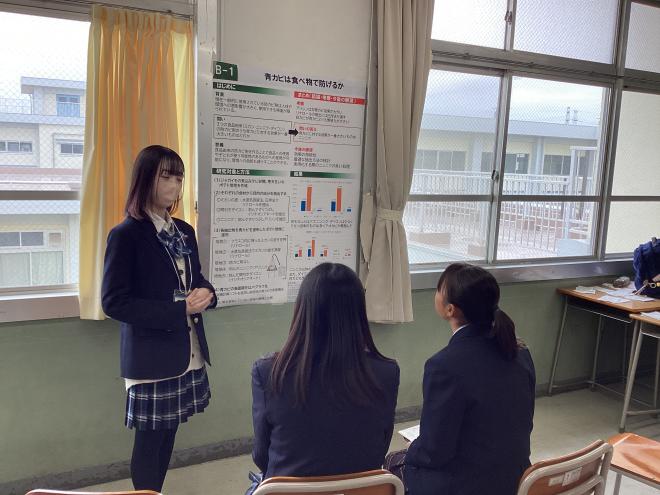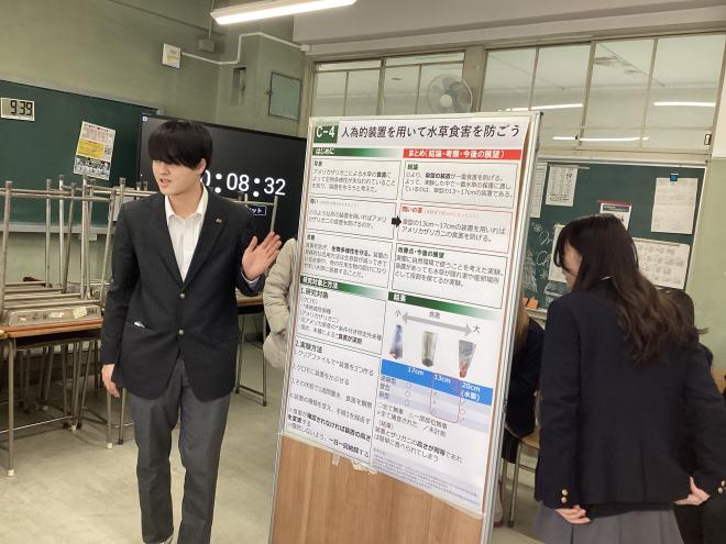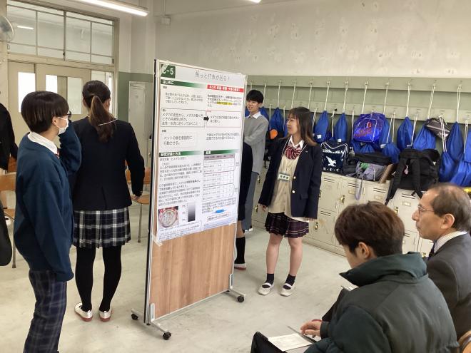 本校からは先日、理数探究発表会にて優秀探究賞を受賞したB-1班(発表題目:青カビは食べ物で防げるか(PDF:790KB))が発表しました。参加者からの質問に対して溌剌と明快に答えており、ポスターセッションならではの相互作用と一体感が生まれていました。来年度、さらなる研究の発展が期待される発表でした。