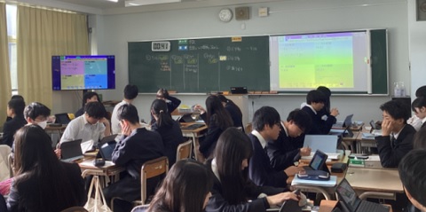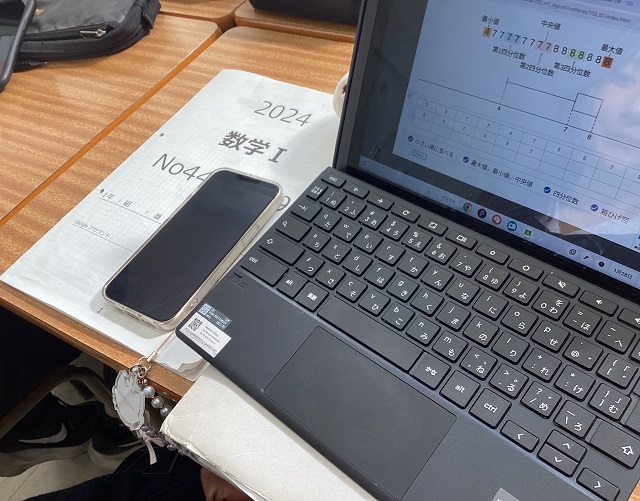 1年次の数学Iの授業ではWebサービスを活用して、冬休み中の各自の睡眠時間を基に箱ひげ図を作成しました。作成したものはスクリーンショットして、Googleスライドに貼り付け、全体で共有しました。