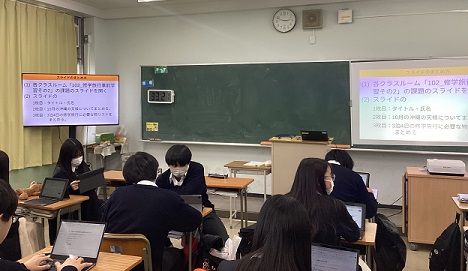 1年次の総合的な探究の時間の授業では、修学旅行の事前学習として、10月の沖縄の天候について、3泊4日の修学旅行に必要な物リストについてGoogleスライドにまとめました。