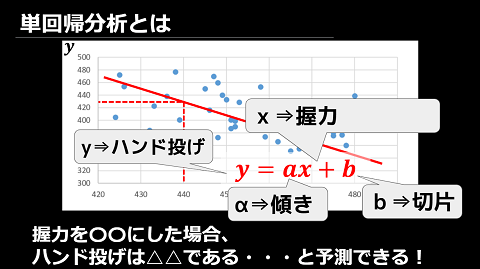 1年次の情報I「データの活用」では、今年度に測定した実際の体力テストデータを活用して単回帰分析を行いました。単回帰分析とは、「握力が30kgの人は、ハンドボール投げのスコアはおよそ○○mになるであろう」というような相関関係のあるデータ間で予測を行う分析方法です。