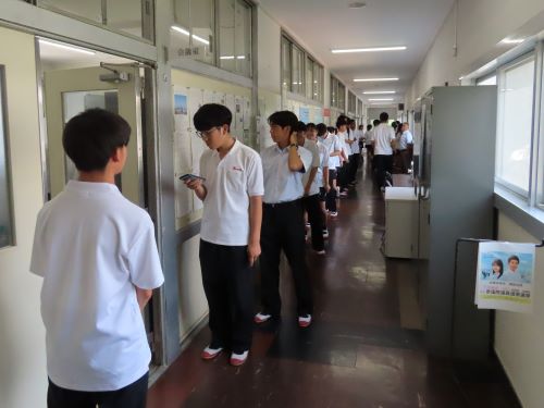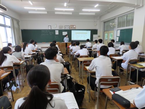 本日で期末テストが終了しました。その後のLHRで2・3年生は進路集会を行いました。暑さのため、各クラスでオンラインでの実施としました。2年生には夏休みを有効に使ってもらうように、希望の進路に向けた計画を各自考える取組を行いました。また3年生にはいよいよ受験本番モードということで、推薦、総合型選抜、一般入試に向けた手続き等の説明が行われました。