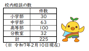 今年度、教育相談担当が校内で受けた相談の数は、表のようになっています。相談は生徒、保護者、教員から受けています。相談数は各学部の所属人数におよそ比例しています。
