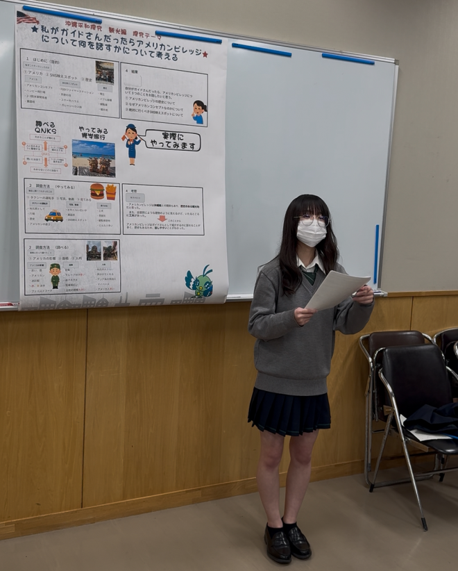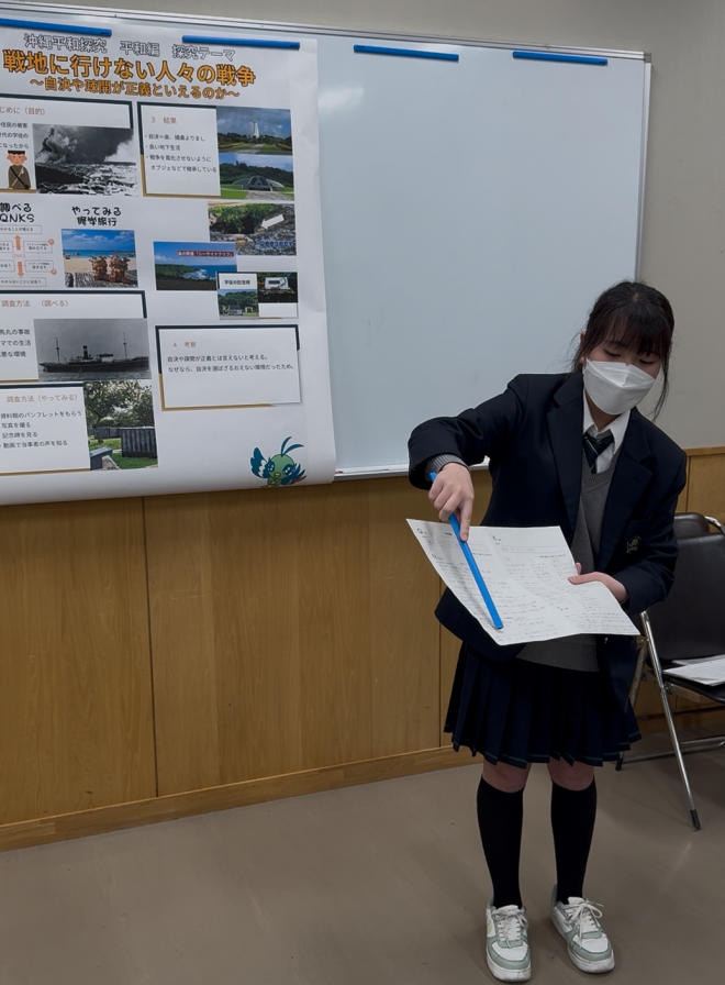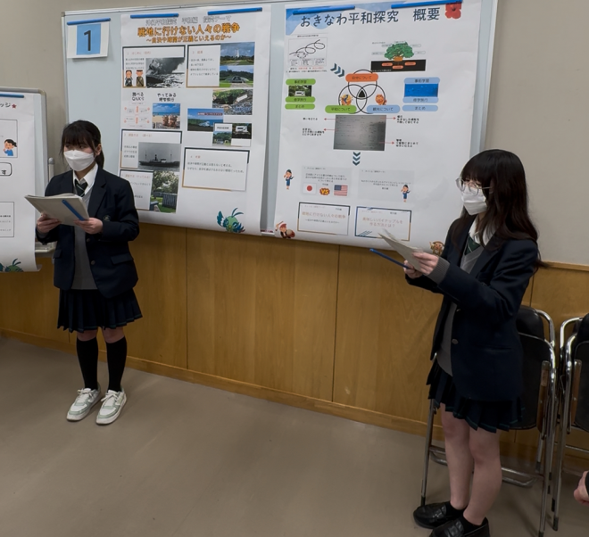本校では、「沖縄平和探究」という大テーマのもと、それぞれが個人のテーマとして沖縄の観光地や沖縄戦などの平和について、探究活動を行ってきました。実際に修学旅行で沖縄を訪れ、現地での見聞も伝えることができました。