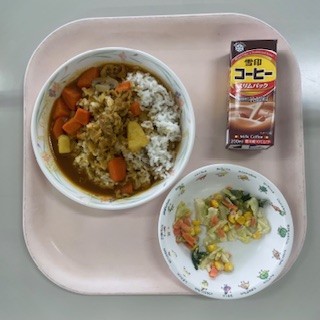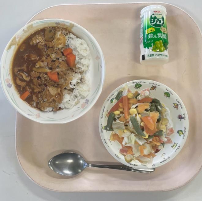 ハヤシライス、彩りサラダ、ジョア マスカット味