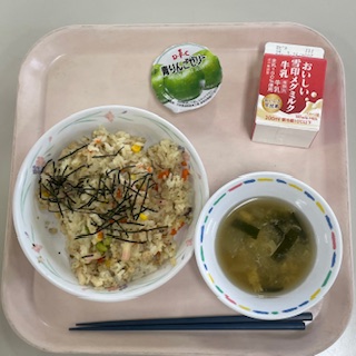 ちらし寿司、ビーフン入りニラ玉汁、青リンゴゼリー、牛乳