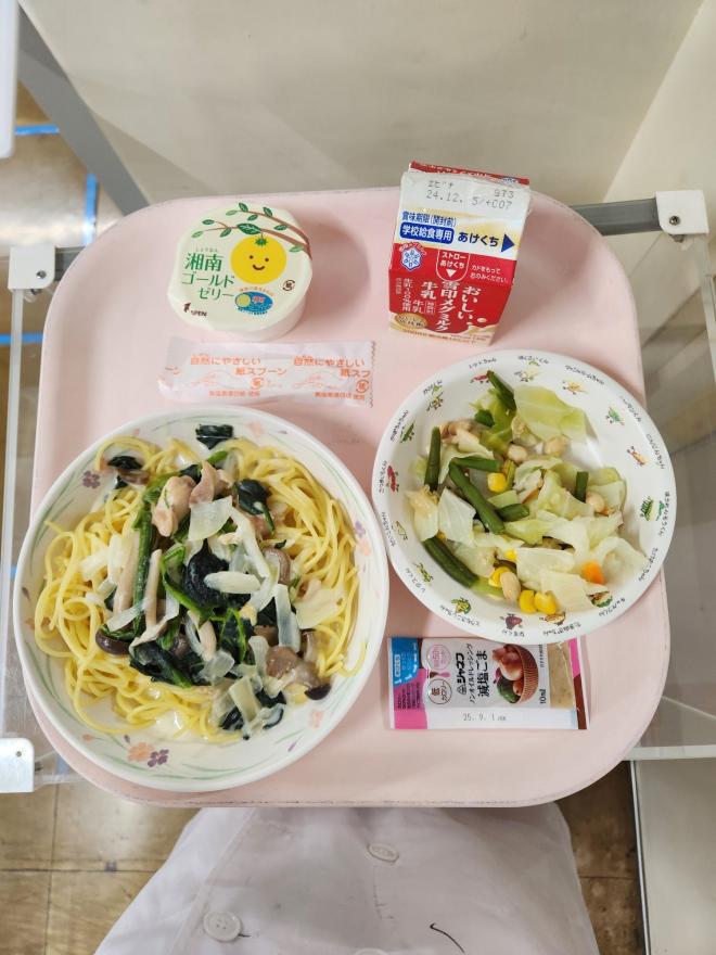 | ほうれん草のクリームスパゲティ、牛乳、キャベツと豆のサラダ、湘南ゴールドゼリー |