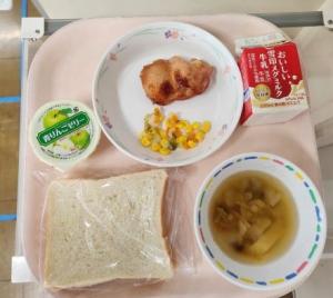 | はちみつ食パン、牛乳、照り焼きチキン、きのこスープ、さっぱりサラダ、青りんごゼリー |