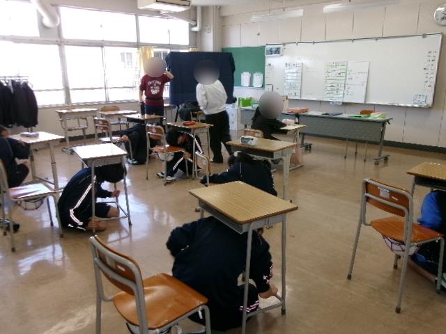 1年生の教室では、「姿勢を低くし、机の下などの安全な場所で身を守ってください」というアナウンスに従い、ヘルメットをかぶり机の下にしっかりと身をかくしていました。皆さん、とても落ち着いて行動できていました。いつでも、どこでも、災害は突然やって来ます。まずは、自分の身を守ることを学びました。