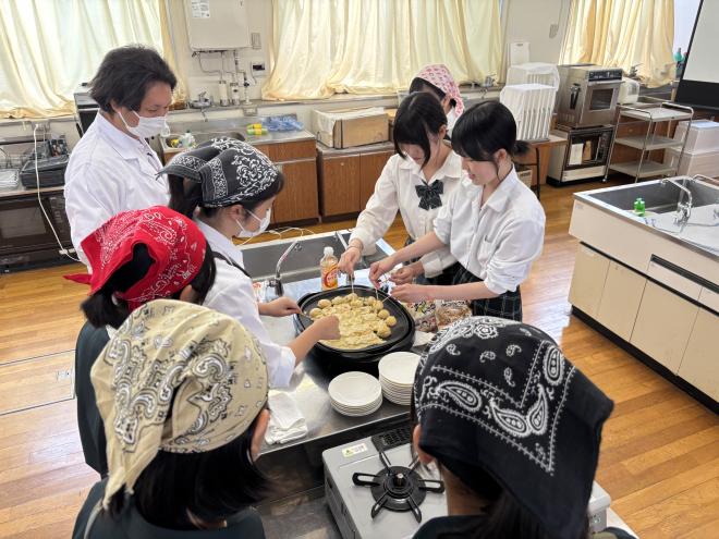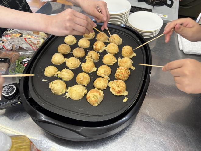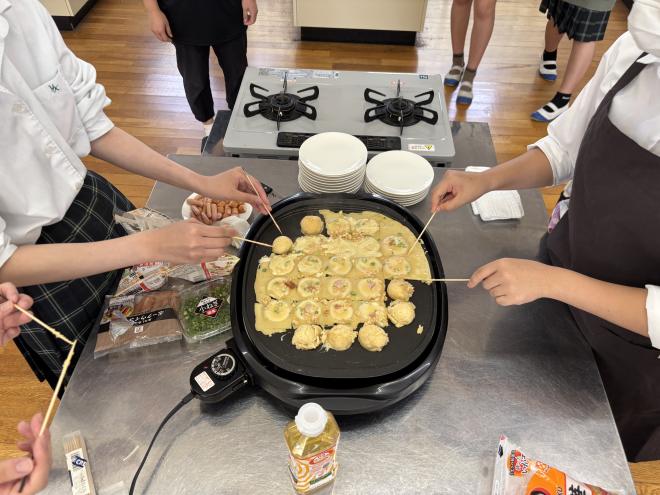 家庭部では毎週水曜日に活動しています。文化祭に向けたクッキー作りや、生徒たちが作りたいものを中心にレシピを決めています。今回はたこやきを作りました。