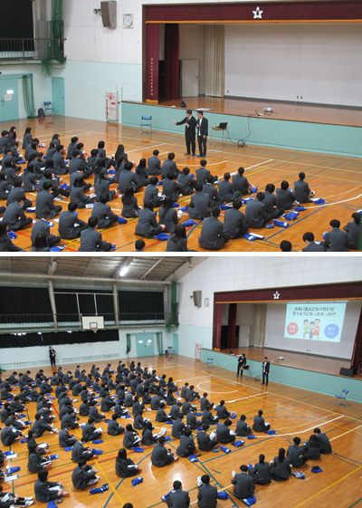 講師としてお招きしたのは、お笑いコンビ「オシエルズ」のお二人、矢島ノブ雄様と野村真之介様です。毎年、多くの学校で進路講演を行っていらっしゃいます。前半は「進路漫才」を中心に、笑いの要素を盛り込みながら「働くとはどういうことなのか?」についてご講演いただきました。後半ではサイコロを用いた「コロコロ人生劇場」というワークショップが行われ、正社員とフリーターの生涯賃金の違い、将来生活をするうえでお金が必要だということを学べる活動となりました。