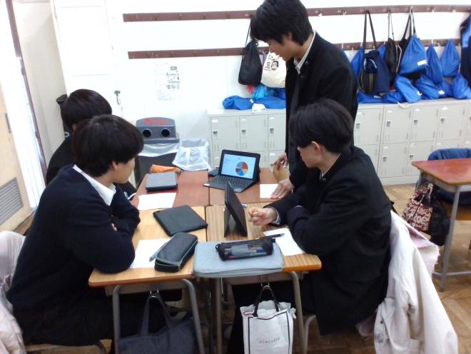 12月9日、16日(月曜日)の総合的な探究の時間では、〔情報収集〕を行いました。各グループが設定した仮説に対して必要な情報を多面的な視点(インターネット調査、文献調査、インタビュー調査、アンケート調査など)で収集しました。
