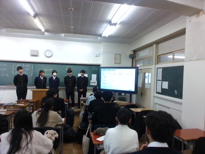 2月3日、10日(月曜日)の総合的な探究の時間では、1・2年生合同で発表会を実施しました。各会場1年生2グループ、2年生10人の割り当てで、発表時間8分、質疑応答3分のタイムスケジュールで実施しました。