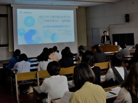 前半の進路講演会は、ベネッセコーポレーションの中野様をお招きして、近年の入試環境の変化や、親子で確認しておきたい内容について、お話いただきました。