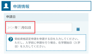 自己情報の取得を行う際、学校が指定した期間以外で申請手続きを行うと、申請情報の申請日を別途指定していただく必要があります。特に7月~翌年6月分審査の場合、7月1日が取得する税情報の年度の区切り目となっているので、それ以前に申請手続きを行う場合は申請日を指定して下さい(下図の赤枠内の申請日)
