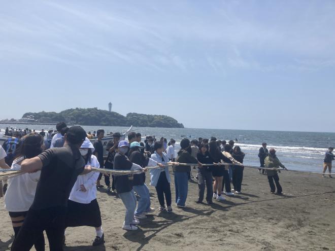 片瀬江ノ島駅に集合し、新江ノ島水族館のそばの片瀬西浜海岸で地曳網体験とバーベキューをしました。初めての地曳網体験でしたが、学年みんなで一つの網を引っ張るのは楽しく、捕れた魚にも興味津々で見たり触ったりしていました。昼食はクラスごとに海岸でバーベキューを行い、午後は班別自主行動として江の島を散策をして解散しました。