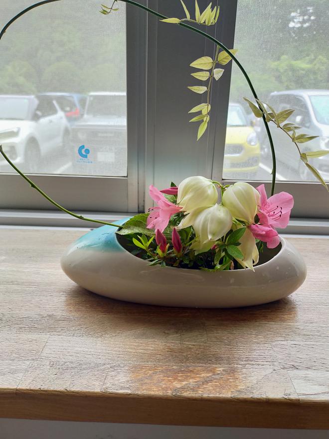 華道部の4月の活動は新入生に生け花を体験してもらいました。作った作品は校内に展示しています。