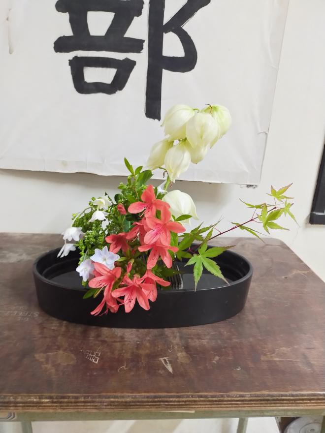 今月の活動では校内に咲いている葉や花を切って各々生けました。