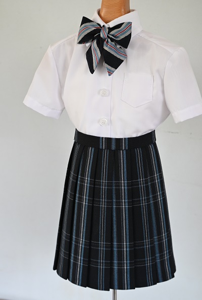 夏はさわやかなブルーのチェック柄のズボンとスカートで、冬服とはイメージが変わります。