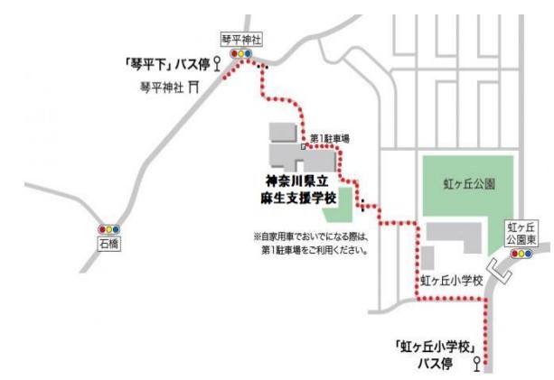 C.小田急線「新百合ヶ丘」駅下車、バス 7番乗り場「たまプラーザ」行きに乗車して約23分「元 石川町」下車、徒歩約7分。